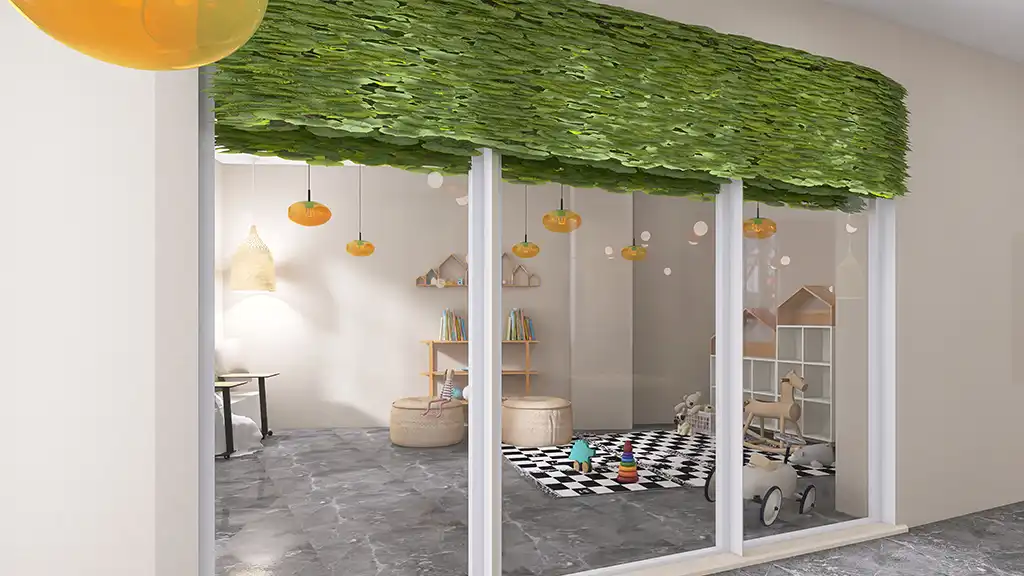 Ein besonderer Bereich des Cafés ist die separate Kinderecke, die farbenfrohe Akzente setzt und den Raum lebendig wirken lässt, ohne den modernen Stil zu brechen.